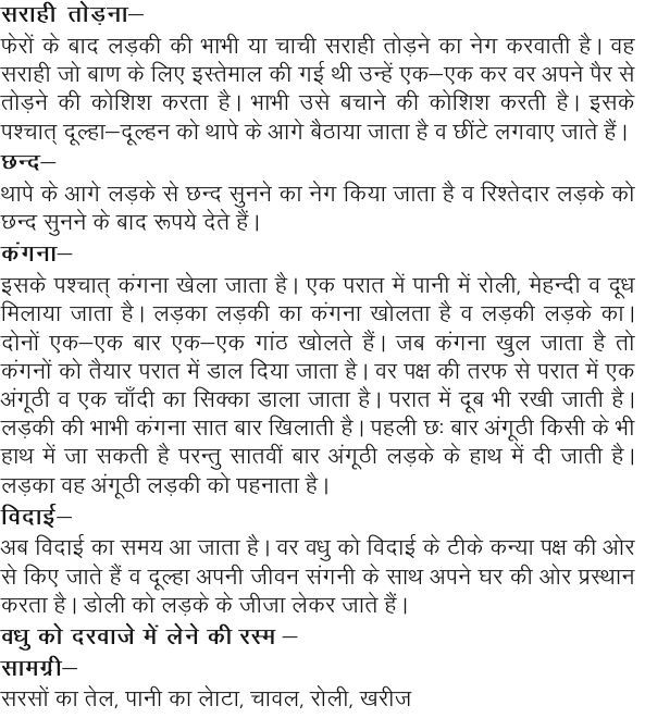 ljkgh rksM+uk& Qsjksa ds ckn yM+dh dh HkkHkh ;k pkph ljkgh rksM+us dk usx djokrh gSA og ljkgh tks ck.k ds fy, bLrseky dh xbZ Fkh mUgsa ,d&,d dj oj vius iSj ls rksM+us dh dksf”k”k djrk gSA HkkHkh mls cpkus dh dksf”k”k djrh gSA blds i”pkr~ nwYgk&nwYgu dks Fkkis ds vkxs cSBk;k tkrk gS o NhaVs yxok, tkrs gSaA NUn& Fkkis ds vkxs yM+ds ls NUn lquus dk usx fd;k tkrk gS o fj”rsnkj yM+ds dks NUn lquus ds ckn :i;s nsrs gSaA daxuk& blds i”pkr~ daxuk [ksyk tkrk gSA ,d ijkr esa ikuh esa jksyh] esgUnh o nw/k feyk;k tkrk gSA yM+dk yM+dh dk daxuk [kksyrk gS o yM+dh yM+ds dkA nksuksa ,d&,d ckj ,d&,d xkaB [kksyrs gSaA tc daxuk [kqy tkrk gS rks daxuksa dks rS;kj ijkr esa Mky fn;k tkrk gSA oj i{k dh rjQ ls ijkr esa ,d vaxwBh o ,d pk¡nh dk flDdk Mkyk tkrk gSA ijkr esa nwc Hkh j[kh tkrh gSA yM+dh dh HkkHkh daxuk lkr ckj f[kykrh gSA igyh N% ckj vaxwBh fdlh ds Hkh gkFk esa tk ldrh gS ijUrq lkroha ckj vaxwBh yM+ds ds gkFk esa nh tkrh gSA yM+dk og vaxwBh yM+dh dks igukrk gSA fonkbZ& vc fonkbZ dk le; vk tkrk gSA oj o/kq dks fonkbZ ds Vhds dU;k i{k dh vksj ls fd, tkrs gSa o nwYgk viuh thou laxuh ds lkFk vius ?kj dh vksj izLFkku djrk gSA Mksyh dks yM+ds ds thtk ysdj tkrs gSaA o/kq dks njokts esa ysus dh jLe & lkexzh& ljlksa dk rsy] ikuh dk yskVk] pkoy] jksyh] [kjht