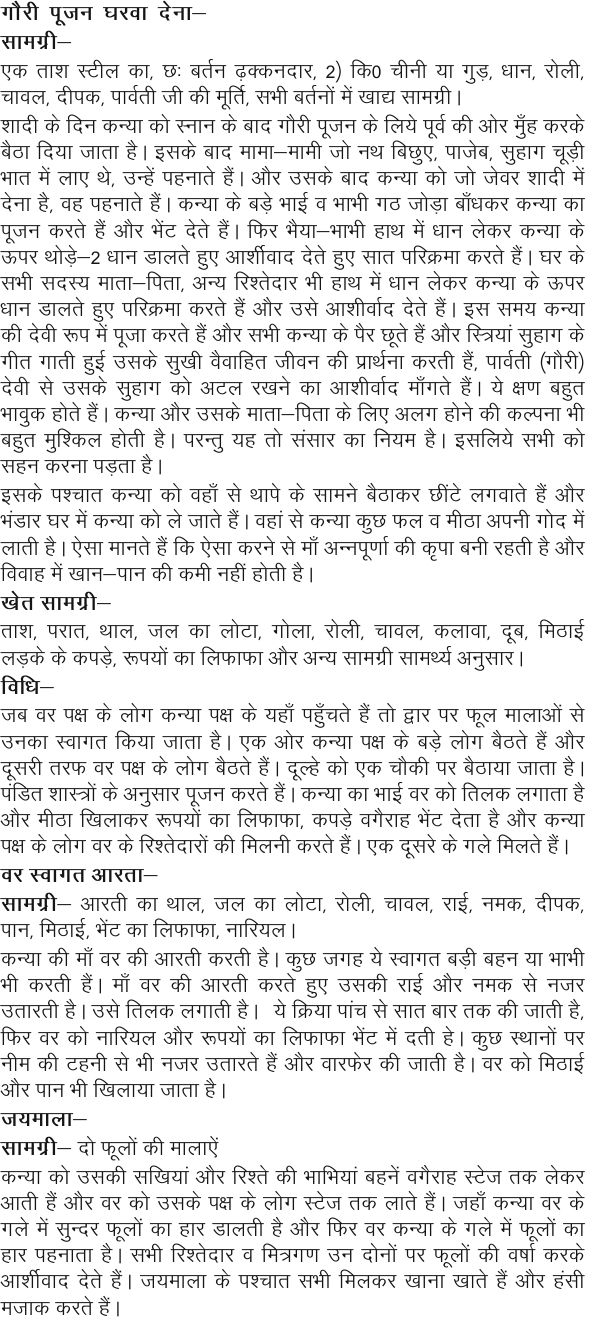 लड़कियों के विवाह के रीति रिवाज हमारे शास्त्रों में मानव जीवन को चार आश्रम में बांटा गया है जिसमें ग्रहस्त आश्रम दूसरे स्थान पर आता है । यह आश्रम जीवन में सबसे महत्वपूर्ण आश्रम है । xkSjh iwtu ?kjok nsuk& lkexzh& ,d rk”k LVhy dk] N% crZu <+Ddunkj] 2½ fd0 phuh ;k xqM+] /kku] jksyh] pkoy] nhid] ikoZrh th dh ewfrZ] lHkh crZuksa esa [kk| lkexzhA “kknh ds fnu dU;k dks Luku ds ckn xkSjh iwtu ds fy;s iwoZ dh vksj eq¡g djds cSBk fn;k tkrk gSA blds ckn ekek&ekeh tks uFk fcNq,] iktsc] lqgkx pwM+h Hkkr esa yk, Fks] mUgsa igukrs gSaA vkSj mlds ckn dU;k dks tks tsoj “kknh esa nsuk gS] og igukrs gSaA dU;k ds cM+s HkkbZ o HkkHkh xB tksM+k ck¡/kdj dU;k dk iwtu djrs gSa vkSj HksaV nsrs gSaA fQj HkS;k&HkkHkh gkFk esa /kku ysdj dU;k ds Åij FkksM+s&2 /kku Mkyrs gq, vk”khZokn nsrs gq, lkr ifjØek djrs gSaA ?kj ds lHkh lnL; ekrk&firk] vU; fj”rsnkj Hkh gkFk esa /kku ysdj dU;k ds Åij /kku Mkyrs gq, ifjØek djrs gSa vkSj mls vk”khokZn nsrs gSaA bl le; dU;k dh nsoh :i esa iwtk djrs gSa vkSj lHkh dU;k ds iSj Nwrs gSa vkSj fL=;ka lqgkx ds xhr xkrh gqbZ mlds lq[kh oSokfgr thou dh izkFkZuk djrh gSa] ikoZrh ¼xkSjh½ nsoh ls mlds lqgkx dks vVy j[kus dk vk”khokZn ek¡xrs gSaA ;s {k.k cgqr Hkkoqd gksrs gSaA dU;k vkSj mlds ekrk&firk ds fy, vyx gksus dh dYiuk Hkh cgqr eqf”dy gksrh gSA ijUrq ;g rks lalkj dk fu;e gSA blfy;s lHkh dks lgu djuk iM+rk gSA blds i'pkr dU;k dks ogk¡ ls Fkkis ds lkeus cSBkdj NhaVs yxokrs gSa vkSj HkaMkj ?kj esa dU;k dks ys tkrs gSaA ogka ls dU;k dqN Qy o ehBk viuh xksn esa ykrh gSA ,slk ekurs gSa fd ,slk djus ls ek¡ vUuiw.kkZ dh d`ik cuh jgrh gS vkSj fookg esa [kku&iku dh deh ugha gksrh gSA [ksr lkexzh& rk'k] ijkr] Fkky] ty dk yksVk] xksyk] jksyh] pkoy] dykok] nwc] feBkbZ yM+ds ds diM+s] :i;ksa dk fyQkQk vkSj vU; lkexzh lkeF;Z vuqlkjA