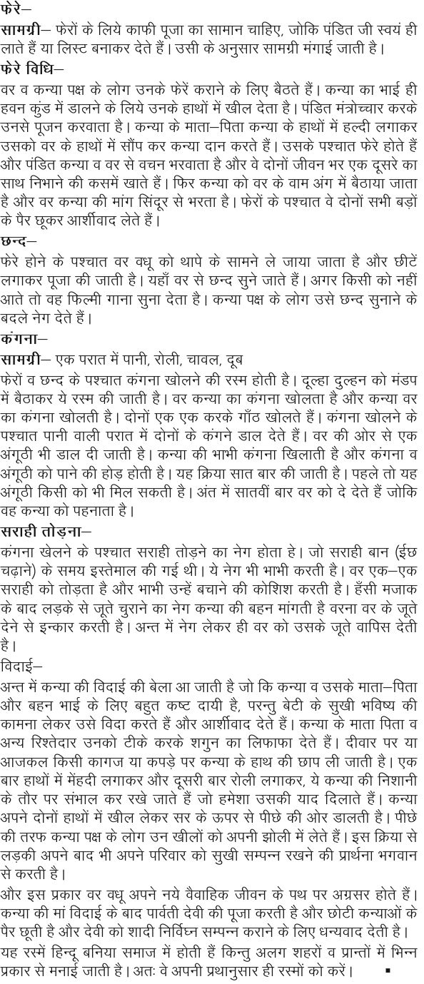 oj o dU;k i{k ds yksx muds Qsjsa djkus ds fy, cSBrs gSaA dU;k dk HkkbZ gh gou dqaM esa Mkyus ds fy;s muds gkFkksa esa [khy nsrk gSA iafMr ea=ksPpkj djds muls iwtu djokrk gSA dU;k ds ekrk&firk dU;k ds gkFkksa esa gYnh yxkdj mldks oj ds gkFkksa esa lkSai dj dU;k nku djrs gSaA mlds i'pkr Qsjs gksrs gSa vkSj iafMr dU;k o oj ls opu Hkjokrk gS vkSj os nksuksa thou Hkj ,d nwljs dk lkFk fuHkkus dh dlesa [kkrs gSaA fQj dU;k dks oj ds oke vax esa cSBk;k tkrk gS vkSj oj dU;k dh ekax flanwj ls Hkjrk gSA Qsjksa ds i'pkr os nksuksa lHkh cM+ksa ds iSj Nwdj vk'khZokn ysrs gSaA